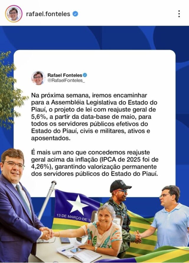 O governador Rafael Fonteles anunciou, nesta sexta-feira (20), em suas redes sociais, que o Governo do Estado vai enviar à Assembleia Legislativa do Piauí, na próxima semana, o projeto de lei com o reajuste geral de 5,6% para os servidores públicos estaduais efetivos, a partir da data-base de maio.