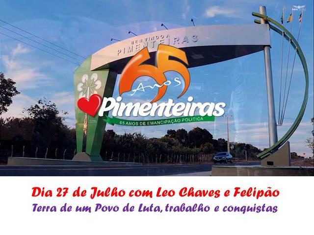 A contagem regressiva para os 65 anos de Pimenteiras já começou. A Prefeitura de Pimenteiras preparou uma programação especial para o aniversário que no dia 27 de julho recebe dois grandes shows, o forrozeiro Felipão que promete levantar a galera, o cantor Leo Chaves da dupla Victor e Leo, que se apresentará pela primeira vez na cidade.