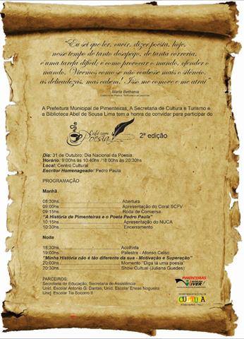 A Prefeitura de Pimenteiras por intermédio da Secretaria Municipal de Cultura e Turismo com apoio da Biblioteca Abel de Sousa Lima realizará nesta quinta-feira (31), a 2ª Edição do Café com Poesia.