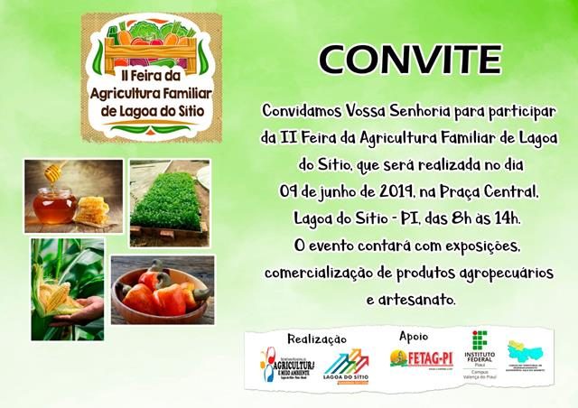 A Prefeitura de Lagoa do Sitio, através da Secretaria de Agricultura e Meio Ambiente realizará no próximo dia 09 de junho, a 2ª Feira da Agricultura Familiar de Lagoa do Sitio.