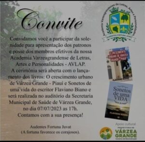 A Academia Varzeagrandense de Letras, Artes e Personalidades (AVLAP) realizou uma sessão solene para o lançamento de dois livros: A Lenda da Sereia do Poço Feio e Poemas e Reflexões, ambos do escritor local Flaviano Biano.