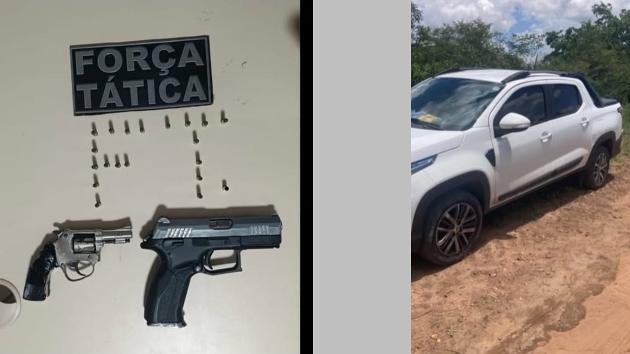 Durante a abordagem e a busca em um veículo Fiat Strada, os policiais encontraram um revólver calibre .22 com munições, além de munições adicionais e uma pistola de airsoft.
