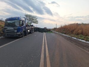 O motorista da carreta juntou parte da mercadoria e a outra foi levada pelos motoristas que passavam pelo local. Após ser informada, a Policia Rodoviária sinalizou o local e deixou o motorista esperando a seguradora.