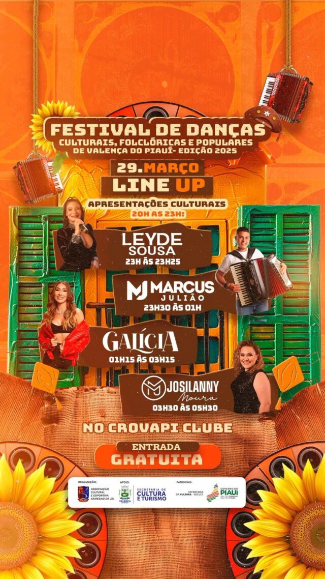 Acontece hoje em Valença do Piauí o Festival de Danças Culturais, Folclóricas e Populares, que chega à edição 2025 com uma programação rica em tradição, diversidade e arte. O evento acontece neste sábado, 29 de março, no Crovapi Clube, reunindo apresentações de diversos estilos e expressões culturais.