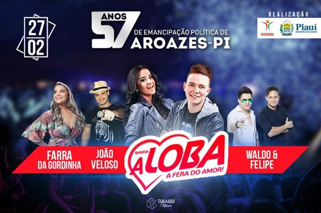 Para fechar a programação, a partir das 22h começam os shows em praça pública, sobem ao palco pela ordem, o cantor João Veloso, seguida da banda Farra da Gordinha, Banda A Loba e Waldo e Felipe fecham com chave de ouro as atividades festivas de Aroazes.
