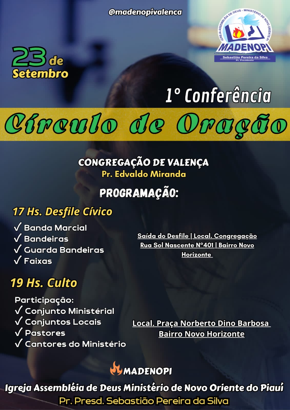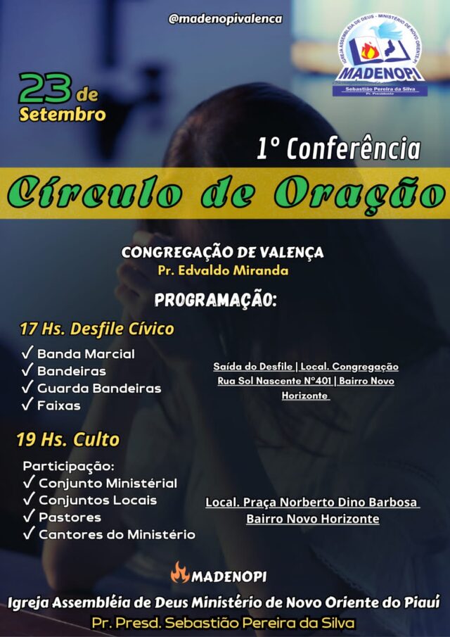 A Assembleia de Deus Ministério Madenopi aqui de Valença do Piaui prepara para o dia 23 de setembro, a 1ª Conferência Circulo de Oração na Praça Norberto Dino Barbosa (Praça do bairro Novo Horizonte).