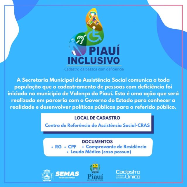 A Secretaria Municipal de Assistência Social de Valença do Piaui está realizando o cadastramento das pessoas com deficiência (Pessoas com Deficiência Física, Pessoas com Deficiência Mental/Intelectual, Pessoas com Deficiência Auditiva, Pessoas com Deficiência Visual, total, monocular ou baixa visão), para serem incluídas no programa “Piaui Inclusivo” de iniciativa do Governo do Estado por intermédio da Secretaria de Estado para a Inclusão da Pessoa com Deficiência (SEID).