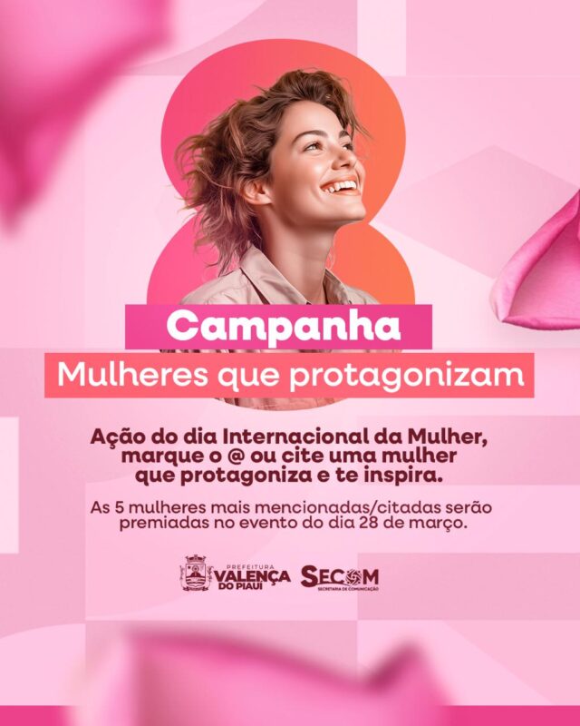 Neste 8 de março, a Prefeitura de Valença do Piauí dá início à programação do mês da mulher com a Campanha “Mulheres que protagonizam”, no Instagram oficial da prefeitura. De acordo com a secretária de comunicação, Mauricelia Sousa, a campanha seguirá até o dia 28 de março. Durante esse período, os cidadãos poderão acessar o perfil oficial e indicar mulheres valencianas que os inspirem e protagonizem ações notáveis. “As 5 mulheres mais mencionadas/citadas serão premiadas no evento do dia 28 de março”, anunciou a secretária.