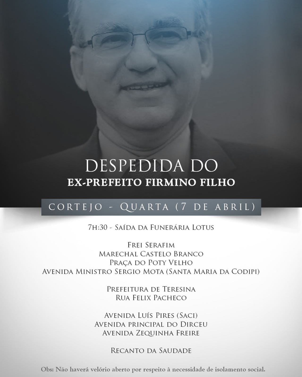 Autoridades da região valenciana e do Piaui manifestaram pesar pela morte do ex-prefeito de Teresina, Firmino Filho ocorrida nesta terça-feira (06) em Teresina. Seu corpo foi encontrado na entrada do prédio do Tribunal de Contas da União (TCU), na Zona Leste da capital.