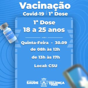 A Secretaria Municipal de Saúde de Valença anunciou novos grupos de pessoas que serão vacinadas na cidade de Valença do Piauí. Serão três dias de vacinação beneficiando bancários, gestantes e pessoas de 44 anos ou mais que ainda não tomaram a primeira dose.
