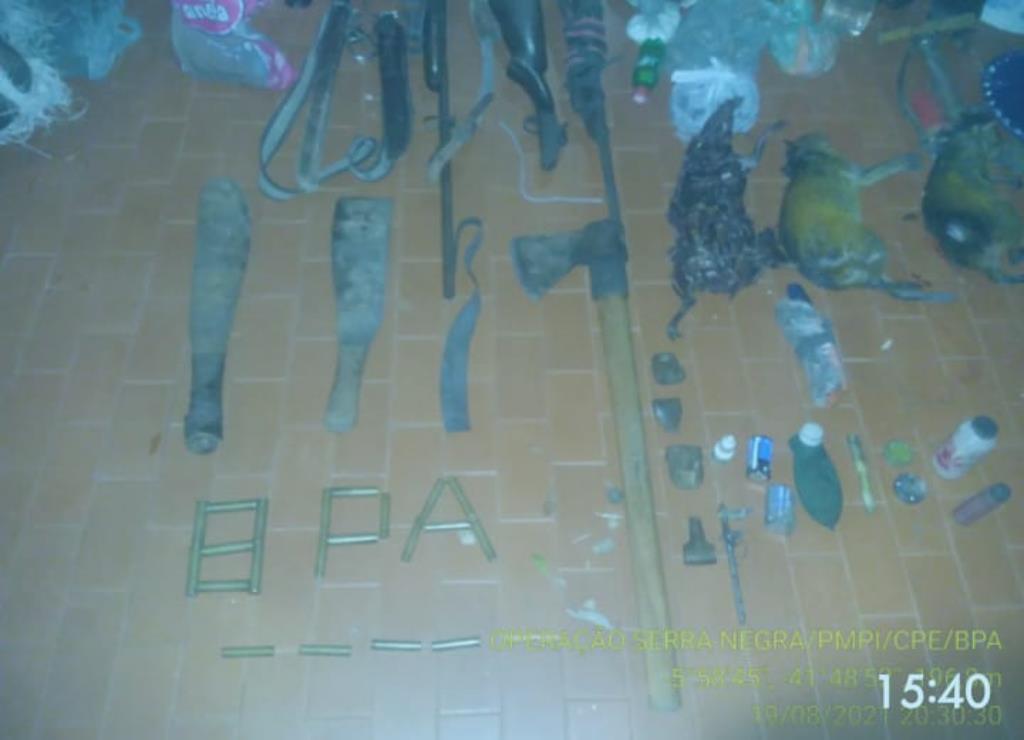 Em toda a operação foram lavrados procedimentos policiais contra infratores em virtude da pratica de crimes ambientais, devido a apreensões de 03 Cotias abatidas, 01 espingardas calibres 36 e 32; 08 cartuchos deflagrados calibre 32; 12 cartuchos deflagrados calibre 36; 04 apitos para caça; 02 Lanternas; 01 garrafa térmica para café; 02 redes; 02 facões; 01 machucado; 03 caixas com espoletas; uma foice; uma par; 01 bomba para bicicleta; 01 alicate; uma chave de fenda; 04 litros de mel; 02 porta chumbo com chumbo sendo, dentre outros materiais.