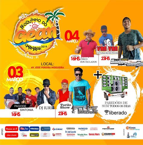 Vem aí o bloquinho do Gean no carnaval 2019. O bloquinho traz uma vasta programação nos dias 3 e 4 de março.