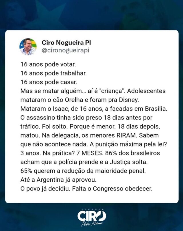 O senador Ciro Nogueira (Progressistas) fez um post em suas redes sociais onde defende que o Congresso Nacional se posicione a favor do projeto que discute a redução da maioridade penal.
