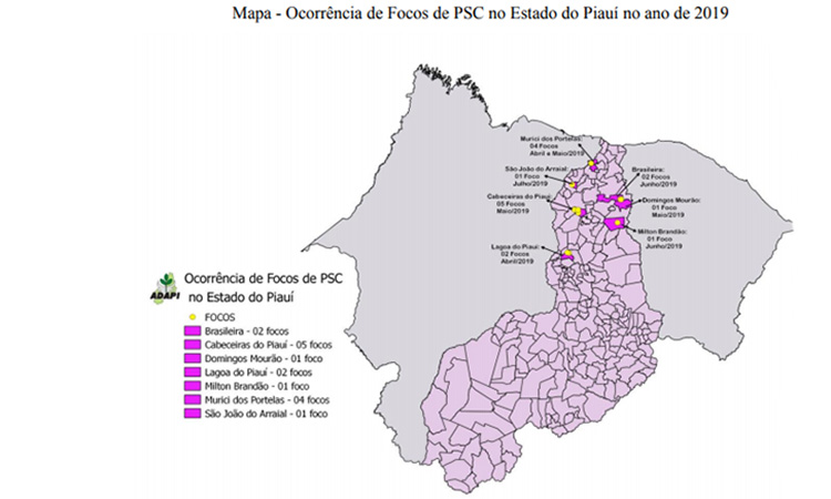 O presidente da Cooperativa Piauiense de Suinocultura, Jesus Rodrigues, afirmou ao Cidadeverde.comque enquanto houver a presença de suínos caipiras haverá possíveis focos da Peste Suína Clássica (PSC) no Piauí. Até o dia 06 de julho deste ano, 16 focos foram confirmados pela Agência de Defesa Agropecuário do Piauí (Adapi) espalhados por sete municípios.Se por um lado a presença da doença assustou principalmente os consumidores da carne, pelo outro, segundo Jesus Rodrigues, as restrições diante da doença e o aumento da fiscalização provocaram a melhoria na qualidade do produto, mesmo diante do sacrifício de alguns animais doentes. Segundo a Adapi, mais de 3500 animais já foram mortos por causa da doença.