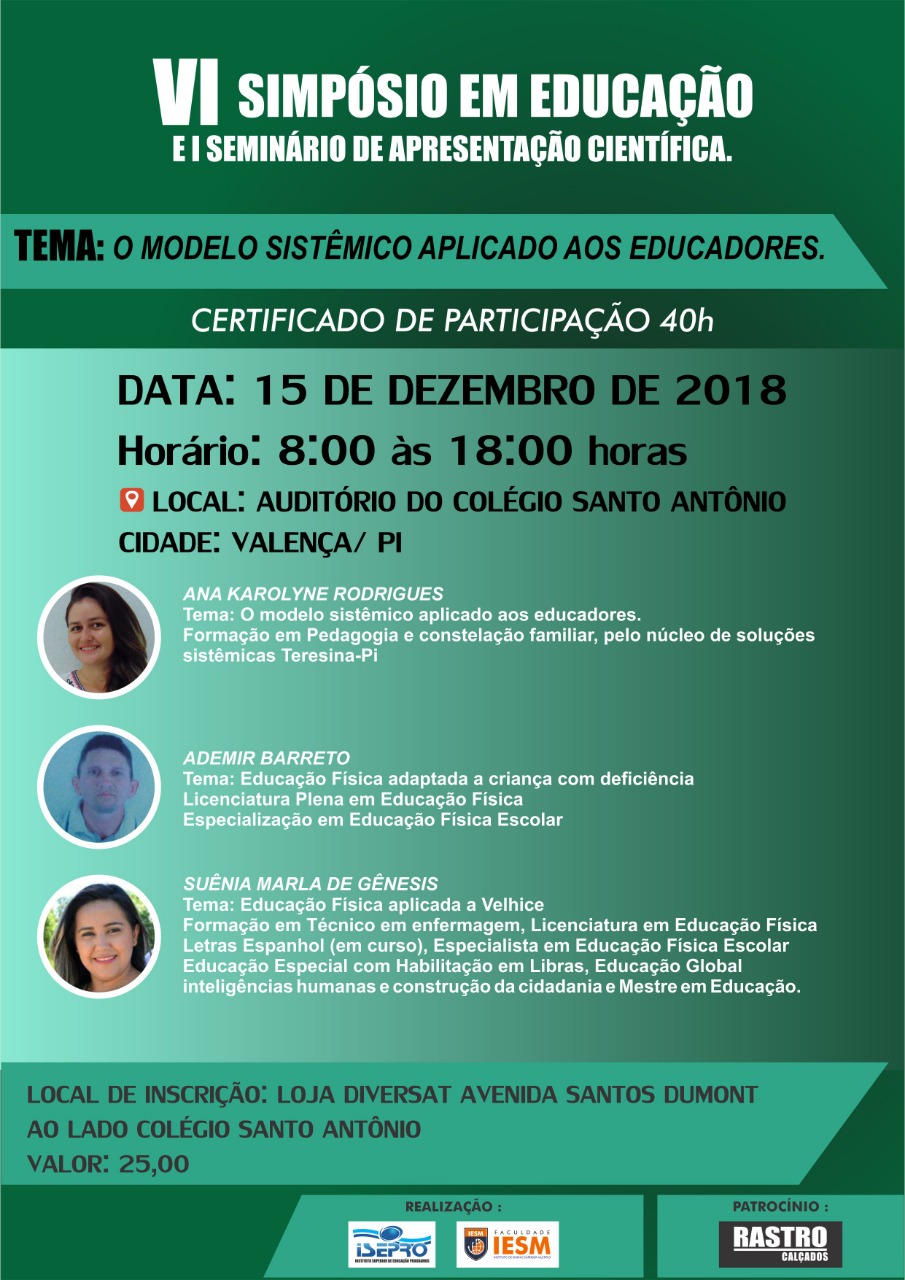 “O Modelo Sistêmico Aplicado aos Educadores” será o tema do VI Simpósio em Educação e o I Seminário de Apresentação Cientifica que será promovido no próximo dia 15 de dezembro no auditório do Colégio Santo Antônio.