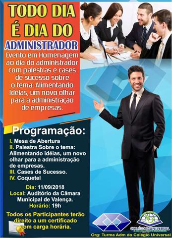 O tema do evento que começa às 19h será: Alimentando ideias, um novo olhar para a administração de empresas. As inscrições já estão abertas no Colégio Universal na Rua Coronel Aníbal Martins. No Brasil o dia do administrador é comemorado no dia 09 de setembro.