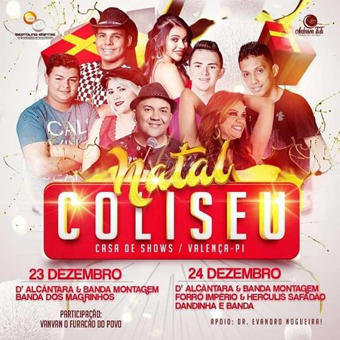 Na noite de Natal, 24 de dezembro, as atrações do Coliseu serão: D`Alcântara e Banda Montagem, Forró Império e Herculis Safadão e a eletrizante Dandinha que retorna a Valença em grande show. A promoção é de Bertolina Dantas.