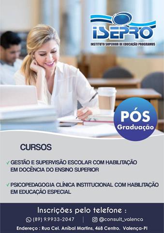Funcionam hoje na sede própria da Consult Valença, o Instituto de Educação Programus (ISEPRO), que está com inscrições abertas para os cursos de pós-graduação em Gestão e Supervisão Escolar com Habilitação em Docência do Ensino Superior e Psicopedagogia Clinica Institucional com Habilitação em Educação Especial.
