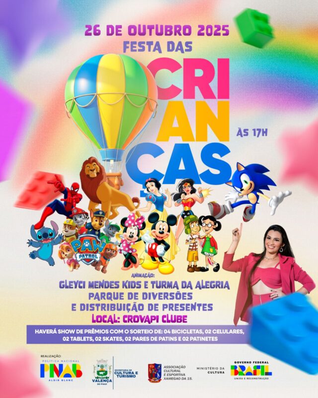 A Associação Cultural e Esportiva Xamegão da 15 (ACEX) com apoio da Secretaria de Cultura e Turismo e Prefeitura de Valença realiza neste domingo (26) no Crovapi a 10ª edição da festa das Crianças 2025. A comemoração tem entrada grátis, sorteio de presentes como 04 bicicletas, 02 celulares, 02 skates, 02 pares de patins, 02 tabletes e 02 patinetes.