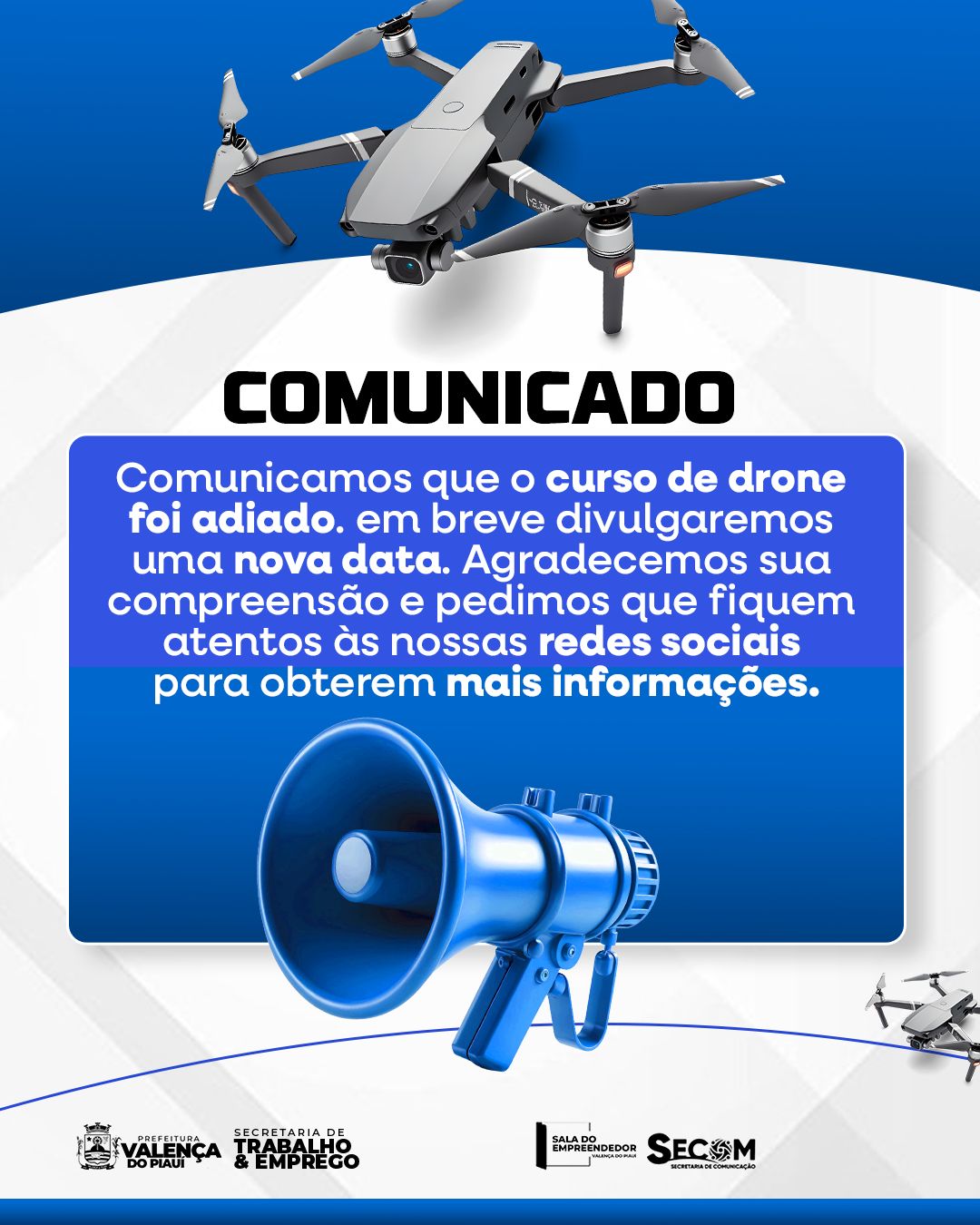 A Secretaria de Trabalho e Emprego de Valença do Piauí comunicou o adiamento do curso de Operação de Drone, que estava inicialmente previsto para ocorrer entre os dias 16 a 18 de maio. De acordo com a nota oficial, o curso foi transferido para o mês de junho, e as novas datas serão informadas em breve. O adiantamento segundo a Secretaria aconteceu devido a grande procura pelo curso no estado. O evento é promovido pela Secretaria de Trabalho e Emprego por meio do Sebrae.