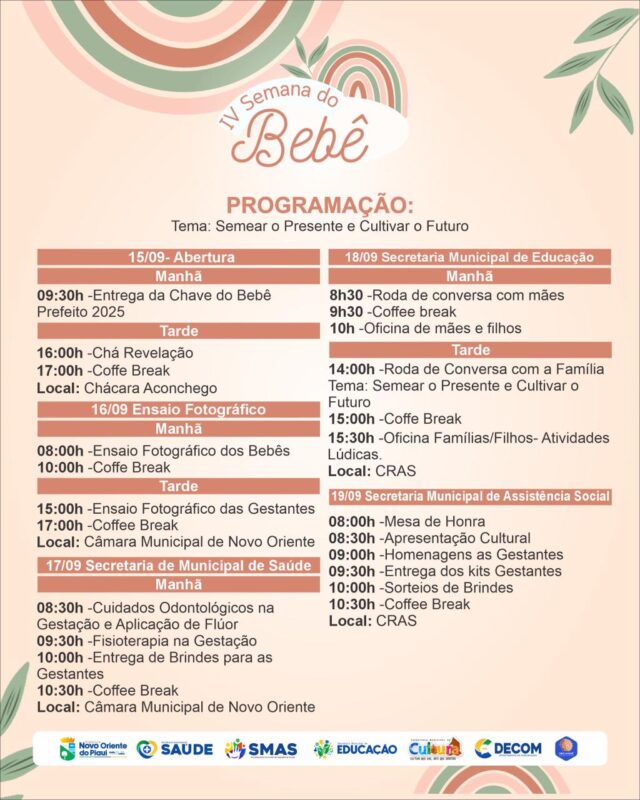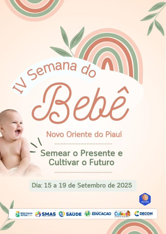 A Prefeitura de Novo Oriente do Piauí vai promover, entre os dias 15 e 19 de setembro, a quarta edição da Semana do Bebê. Com o tema “Semear o Presente e Cultivar o Futuro”, o evento integra o calendário anual do município e é uma ação proposta pelo Selo UNICEF.