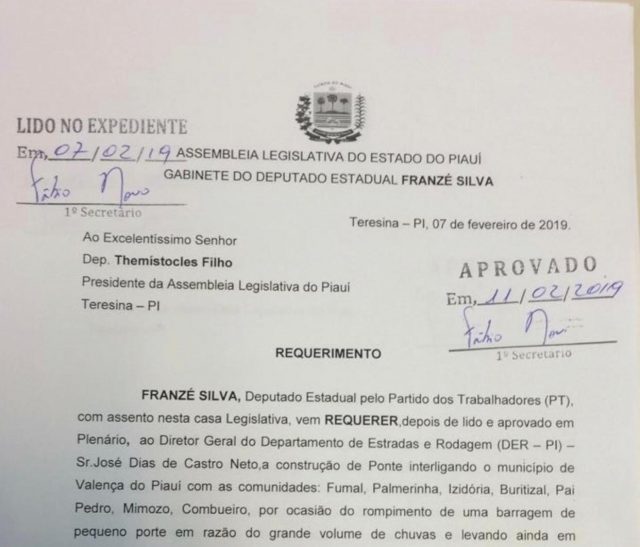 O deputado estadual Franzé Silva do PT, aprovou nesta segunda-feira (11), por unanimidade da Assembleia Legislativa, um requerimento que pede ao Departamento de Estradas e Rodagens (DER-PI), que seja feita uma reconstrução da ponte que interliga a cidade de Valença às comunidades Fumal, Palmeirinha, Isidoria, entre outras.