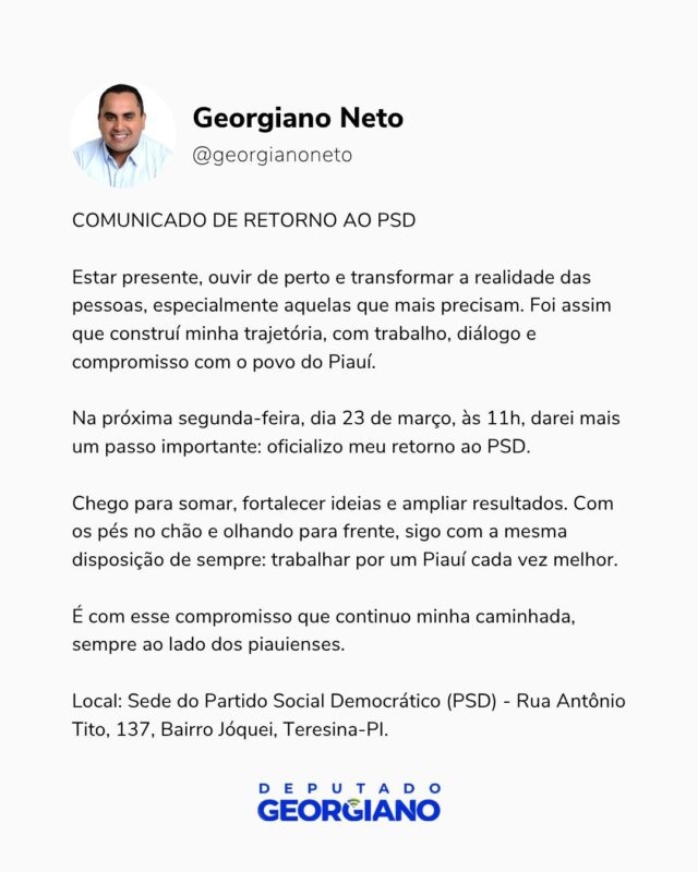 Nas redes sociais, Georgiano Neto ressaltou que a decisão representa mais um passo em sua trajetória política, construída ao longo dos anos com diálogo e proximidade com a população do Piauí.