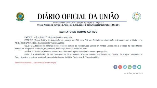 O Diário Oficial da União (DOU), publicou nessa segunda-feira (07), o Extrato de Termo Aditivo, celebrado entre a União e a Rádio Confederação Valenciana LTDA, por intermédio do Ministério da Ciência, Tecnologia, Inovações e Comunicações (MCTIC) para a adaptação da outorga de execução do serviço de Radiodifusão Sonora em Ondas Médias para a outorga de Radiodifusão Sonora em Frequência Modulada.