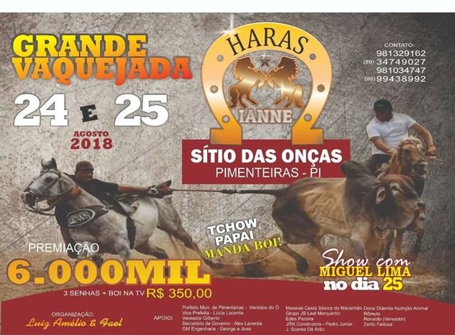 Dias 24 e 25 de agosto será realizado no Parque Ianne em Sitio das Onças município de Pimenteiras uma grande vaquejada que distribuirá 6 mil em premiações e mais 3 senhas de 350 reais.