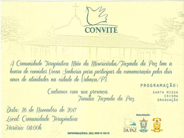 A Comunidade Terapêutica Mãe da Misericórdia (Fazenda da Paz Valença) irá comemorar nesse domingo (26) seus dois anos de Valença. A programação começa às 08h da manha na sede da Fazenda da Paz na BR 316 com uma Santa Missa, Crisma e Graduação. O convite é aberto a toda sociedade valenciana para comemorar os dois anos da Fazenda da Paz em Valença que vem prestando um grande serviço a nossa comunidade.