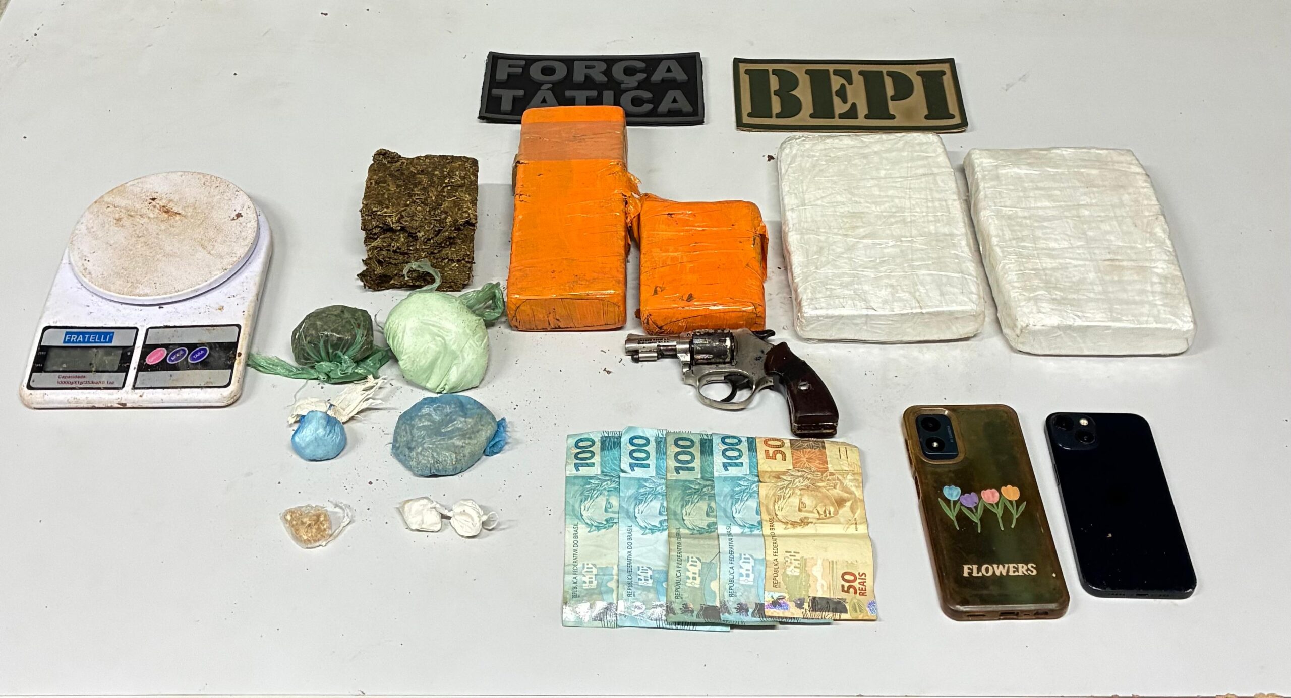 Durante a abordagem, foram encontrados com J.P.C.L. 2 tabletes de substância análoga à cocaína. Em ato contínuo, durante buscas na área de mata, os policiais localizaram um balde enterrado, contendo mais porções de substância análoga à cocaína, maconha, crack, uma arma de fogo calibre.22, uma balança de precisão, além de pequenas porções das mesmas drogas citadas.