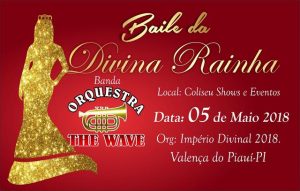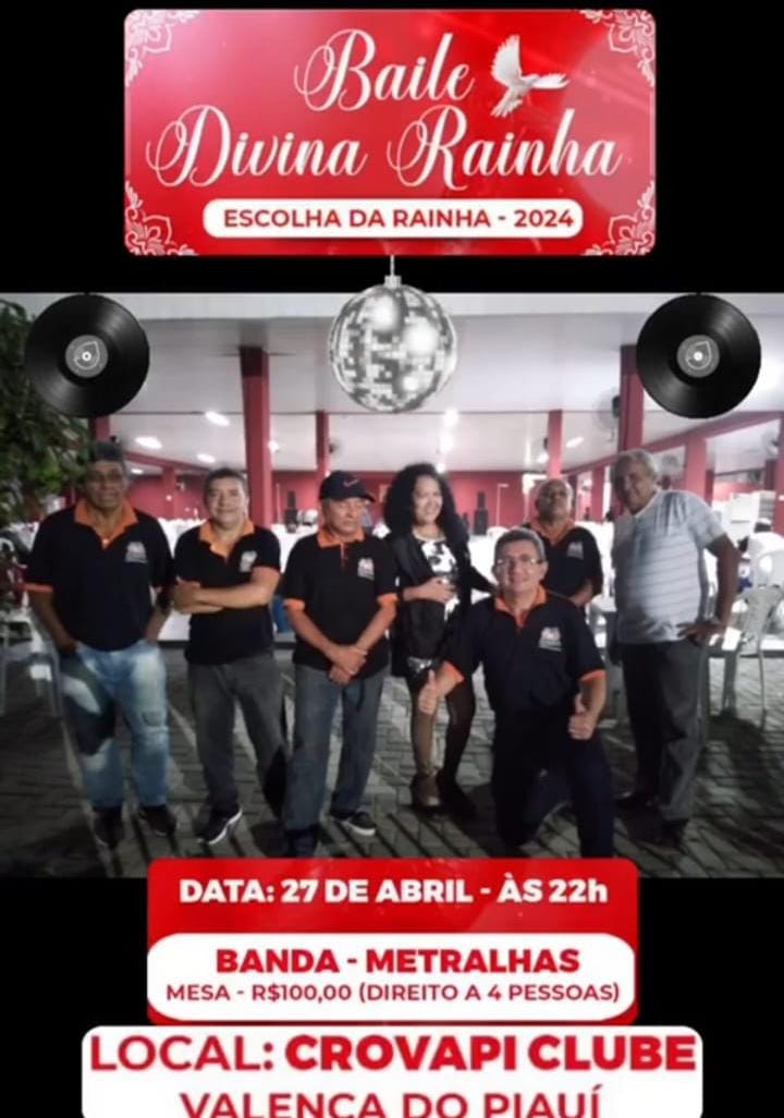 A organização da Festa do Divino Espirito Santo em Valença irá realizar no dia 27 de abril uma grande festa no Crovapi Clube para a escolha da Divina Rainha. A musicalidade ficará por conta da banda Os Metralhas. A mesa custará R$ 100 reais com direito a quatro pessoas. Em 2024 Pentecostes será celebrado no dia 19 de maio em Valença e tem como imperadores o casal Dr. Itamar e Ivete Lima Verde.