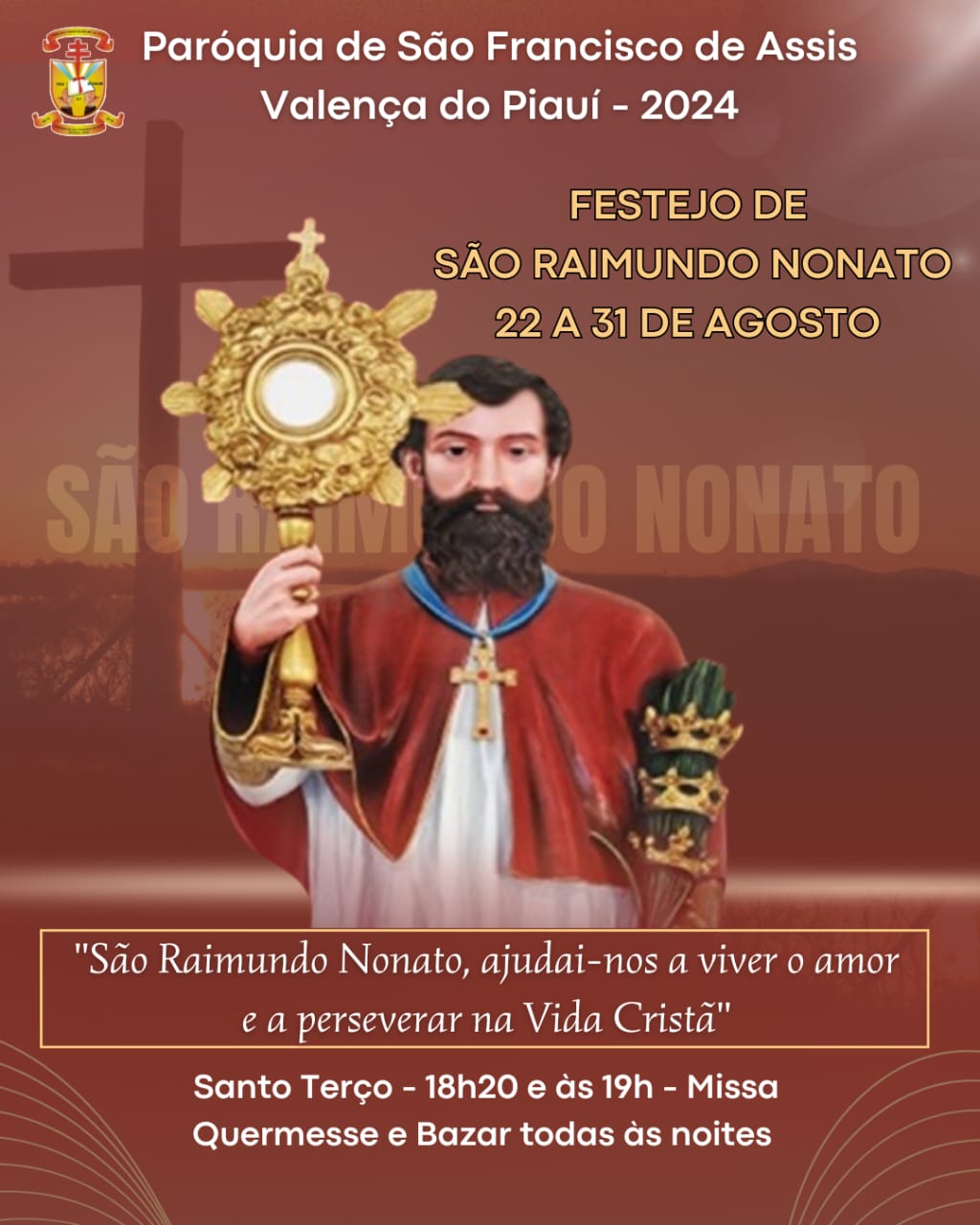 A Comunidade do bairro Lavanderia vai dá início nesta quinta-feira (22) ao Festejo de São Raimundo Nonato, padroeiro da comunidade. Todos os dias haverá o Santo Terço a partir das 18h30 e a Santa Missa será celebrada a partir das 19h. O encerramento acontece dia 31 com procissão às 17h, seguida de Missa Solene às 19h.