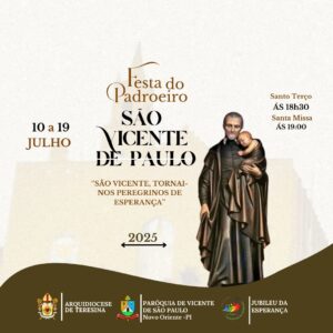 Começa hoje, 10 de julho e vai até o dia 19, a Festa de São Vicente de Paulo, na cidade de Novo Oriente. A programação começa às 17h, desta sexta-feira, com uma procissão saindo da Capela de Nossa Senhora das Candeias, até a Igreja Matriz e termina às 09h, do dia 19 com a missa do padroeiro. Todas as noites haverá novenas e a expectativa e de reunir muitos fieis durante o novenário. Além da programação religiosa, o festejo conta ainda com muitos shows. Uma dessas atrações é a banda Companhia do Forró, com a cantora Márcia Felipe, que se apresenta no dia 19.