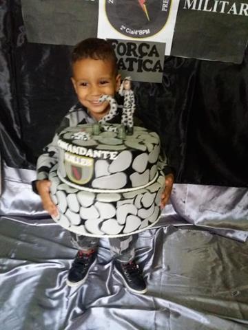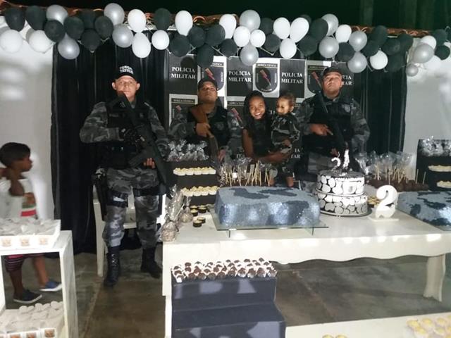 A decoração da festa e o bolo teve como tema a Força Tática e o aniversariante chegou na festa vestido com seu uniforme na viatura da polícia, ladeado pelos “Taticanos” como são conhecidos os policiais da Força Tática.