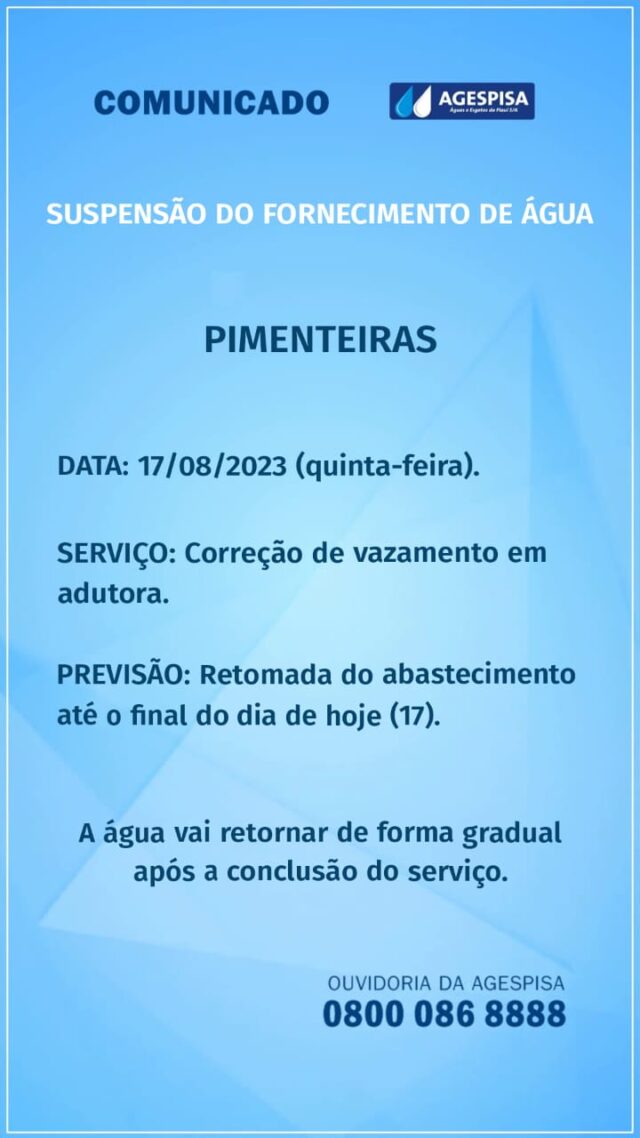 O fornecimento de água será interrompido nesta quinta-feira (17), na cidade de Pimenteiras. A informação foi repassada ao Portal V1 pela assessoria de comunicação da Agespisa que informou ainda que a retomada do abastecimento acontecerá até o final dessa tarde de forma gradual. Ainda segundo a Agespisa, o problema foi gerado devido a um vazamento na adutora.
