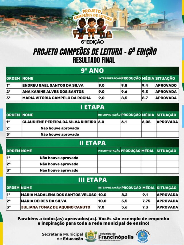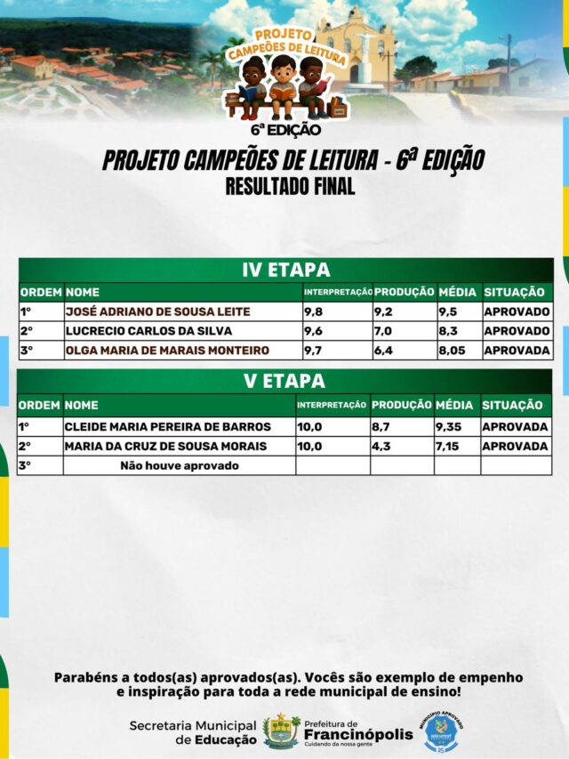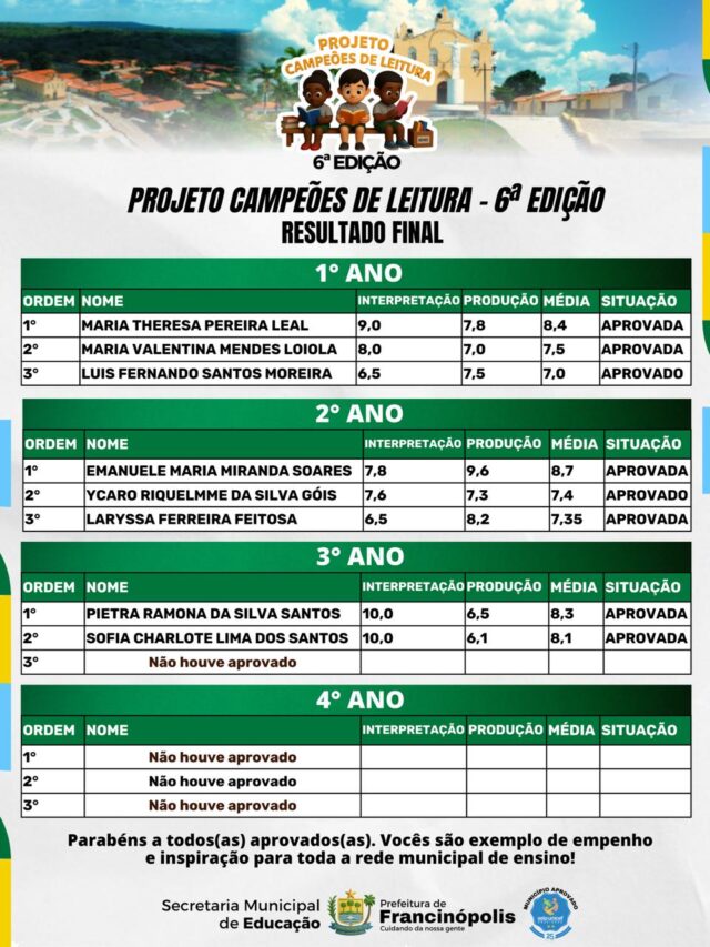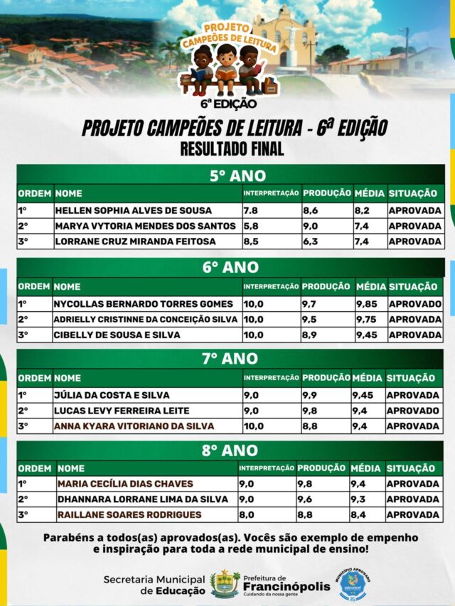A Secretaria Municipal de Educação de Francinópolis divulgou os nomes dos vencedores do Projeto Campeões de Leitura 2025, uma das ações mais significativas de incentivo à leitura no município.