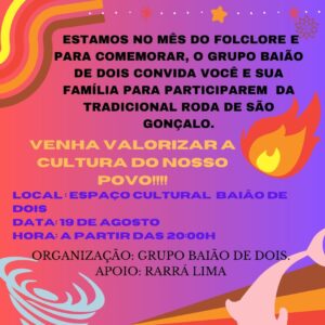 O Grupo Cultural Baião de Dois (Rarrá e Nelsinho Lima) está convidado a todos para participar neste sábado dia 20 de agosto, às 19h, de uma tradicional Roda de São Gonçalo, no Espaço Baião de Dois, na Rua São João.