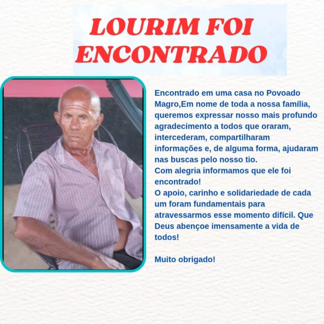Foi encontrado na manhã desta quarta-feira (04), o idoso Lourival Borges Leal (Lourim). O mesmo apareceu em uma casa no povoado Magro, zona rural do município de Inhuma, no Piauí.