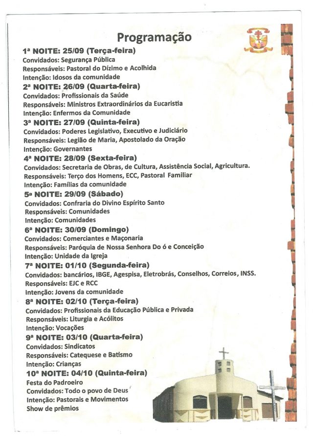 Todos os dias haverá terço ás 18h30 seguida de celebração e quermesse. Dia 1º de outubro acontecerá a benção dos animais às 19h. dia 02 será comemorado o aniversário da paroquia e dia 04 será realizada a procissão de encerramento do festejo com saída da Paroquia de Nossa Senhora do Ó e Conceição às 17h.