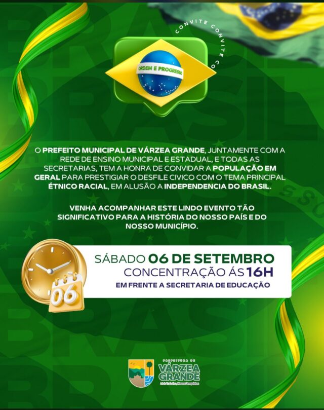 A Prefeitura de Várzea Grande, em parceria com a rede municipal e estadual de ensino, realiza neste sábado, 6 de setembro, o tradicional desfile cívico em comemoração à Independência do Brasil. Neste ano, as comemorações foram antecipadas em um dia, já que a data oficial é celebrada em 7 de setembro.