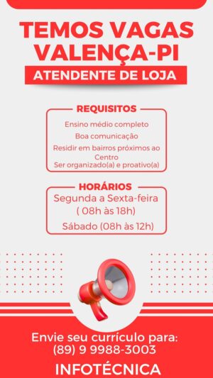 A Loja Infotécnica de Valença do Piauí anunciou que está recebendo currículos para a vaga de atendente. Os interessados podem entregar seus currículos diretamente para Priscila Araújo, entrando em contato pelo número whatsapp (86) 994065260.
