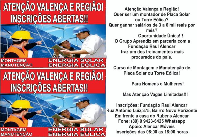 Começa nessa terça-feira (21), as inscrições para o curso de montagem e manutenção de placa solar ou eólica aqui na cidade de Valença. O curso é uma parceria entre o Grupo Aprendiz e a Fundação Raul Alencar.