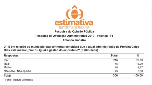 Foram aplicados 300 questionários na cidade e interior entre os dias 01 e 02 de agosto pelo Instituto de Pesquisa Estimativa no município de Valença do Piauí. A cidade possui 20.325 habitantes e 15.246 eleitores. O nível de confiança é de 95% e a margem de erro e de 5,6%.
