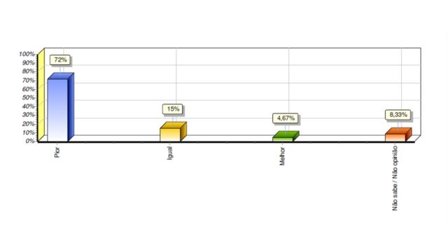 Pior para 72,00%, Igual para 15,00% dos entrevistados e Melhor para 4,67%, Não sabe / Não opina 8,33%.