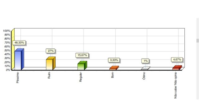 Péssimo para 48,33%, Ruim para 27,00%, Regular para 15,67%, Bom para 3,33% e Ótimo para 1,00% dos entrevistados, Não sabe/ Não opina 4,67%.