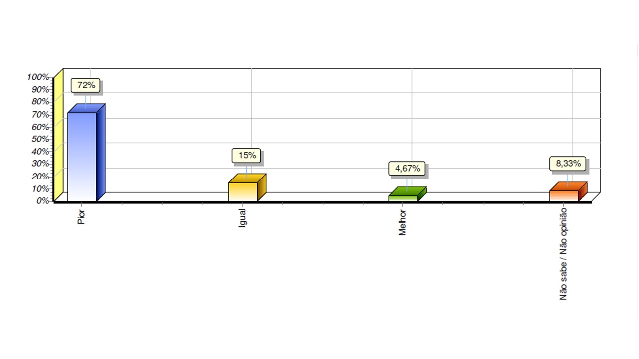 Pior para 72,00%, Igual para 15,00% dos entrevistados e Melhor para 4,67%, Não sabe / Não opina 8,33%.