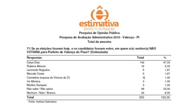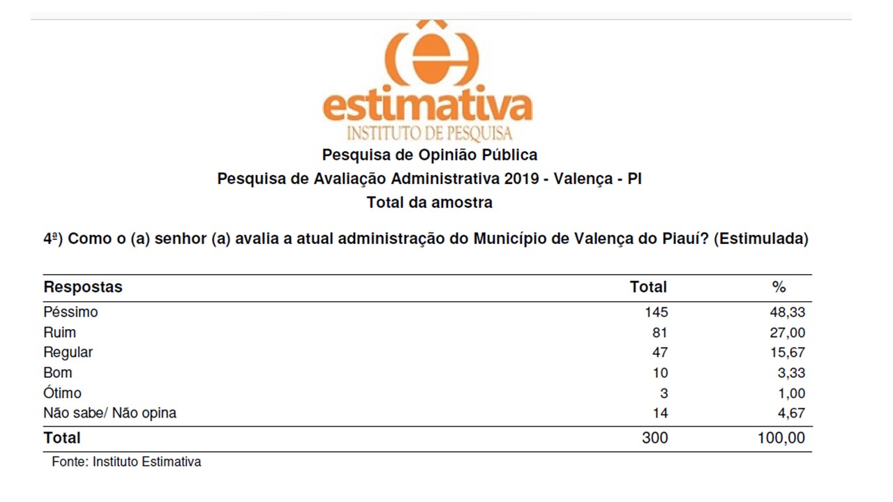 Foram aplicados 300 questionários na cidade e interior entre os dias 01 e 02 de agosto pelo Instituto de Pesquisa Estimativa no município de Valença do Piauí. A cidade possui 20.325 habitantes e 15.246 eleitores. O nível de confiança é de 95% e a margem de erro e de 5,6%.