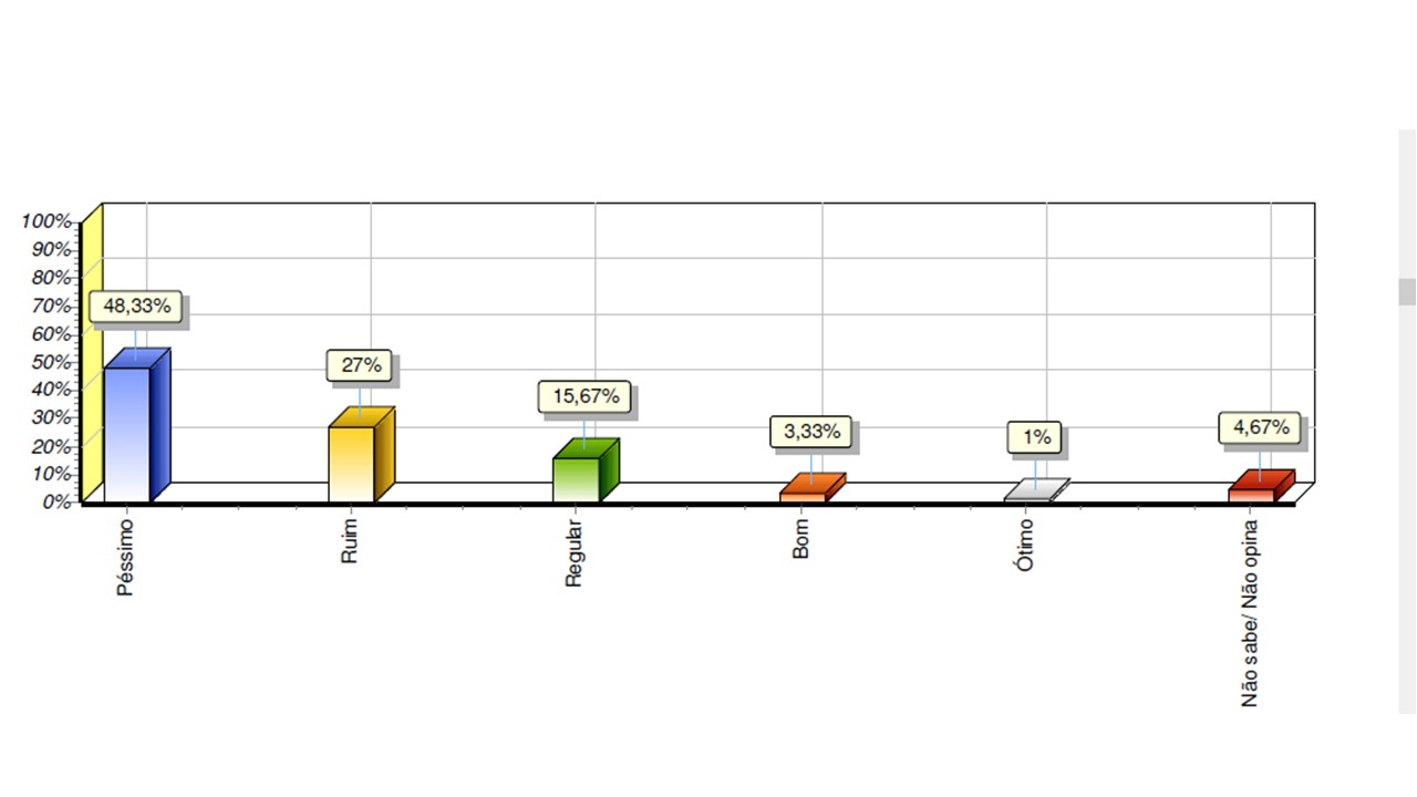 Péssimo para 48,33%, Ruim para 27,00%, Regular para 15,67%, Bom para 3,33% e Ótimo para 1,00% dos entrevistados, Não sabe/ Não opina 4,67%.