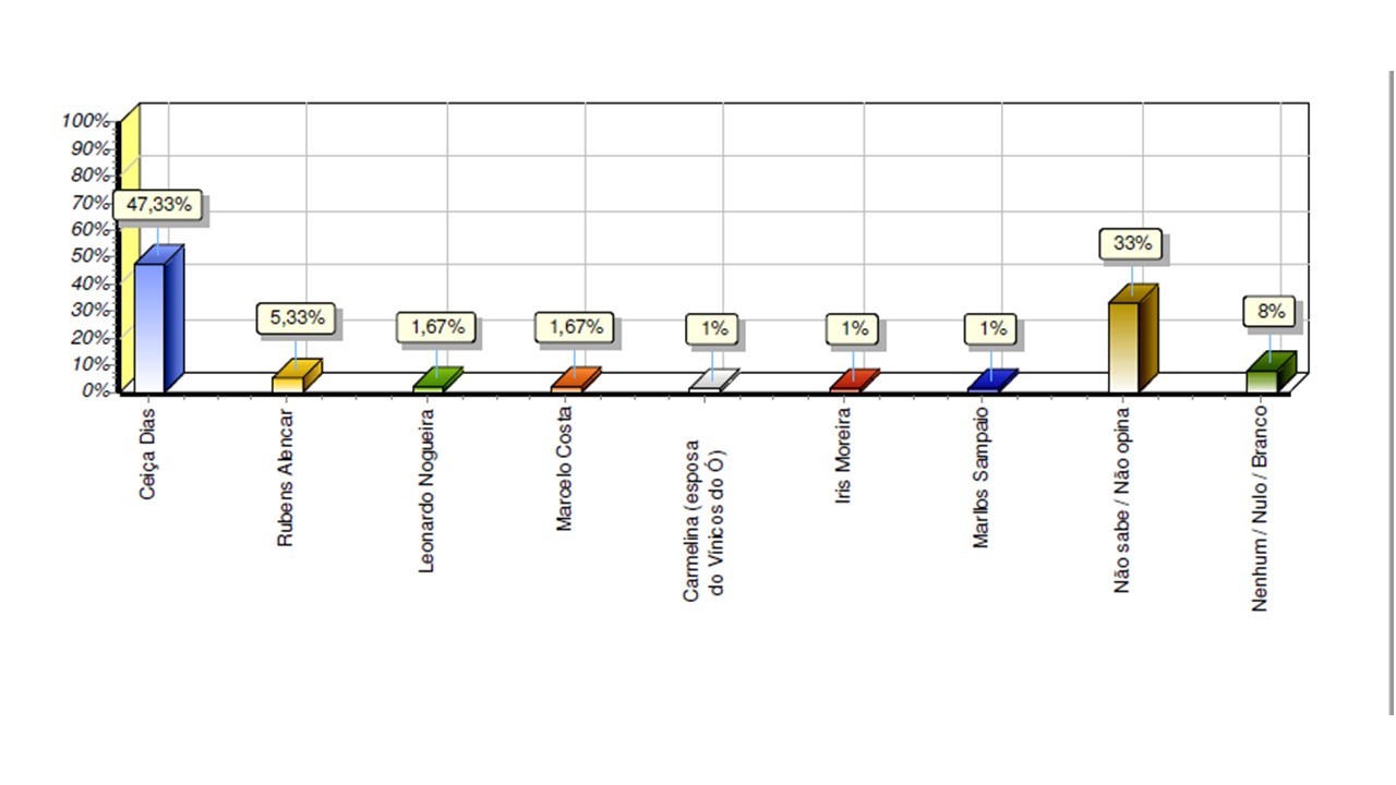 Ceiça Dias, 47,33%, Rubens Alencar 5,33%, Leonardo Nogueira 1,67%, Marcelo Costa 1,67, Carmelina (esposa do Vínicos do Ó), 1,00%, Iris Moreira 1,00%, Marllos Sampaio 1,00%, Não sabe / Não opina 33,00%, Nenhum / Nulo / Branco 8,00%.